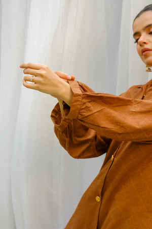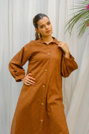 This article consists of a jacquard Two-piece Frock set with an intricate plate detail touch on the neckline, The outfit consists of a long-length style frock and fitted pants.