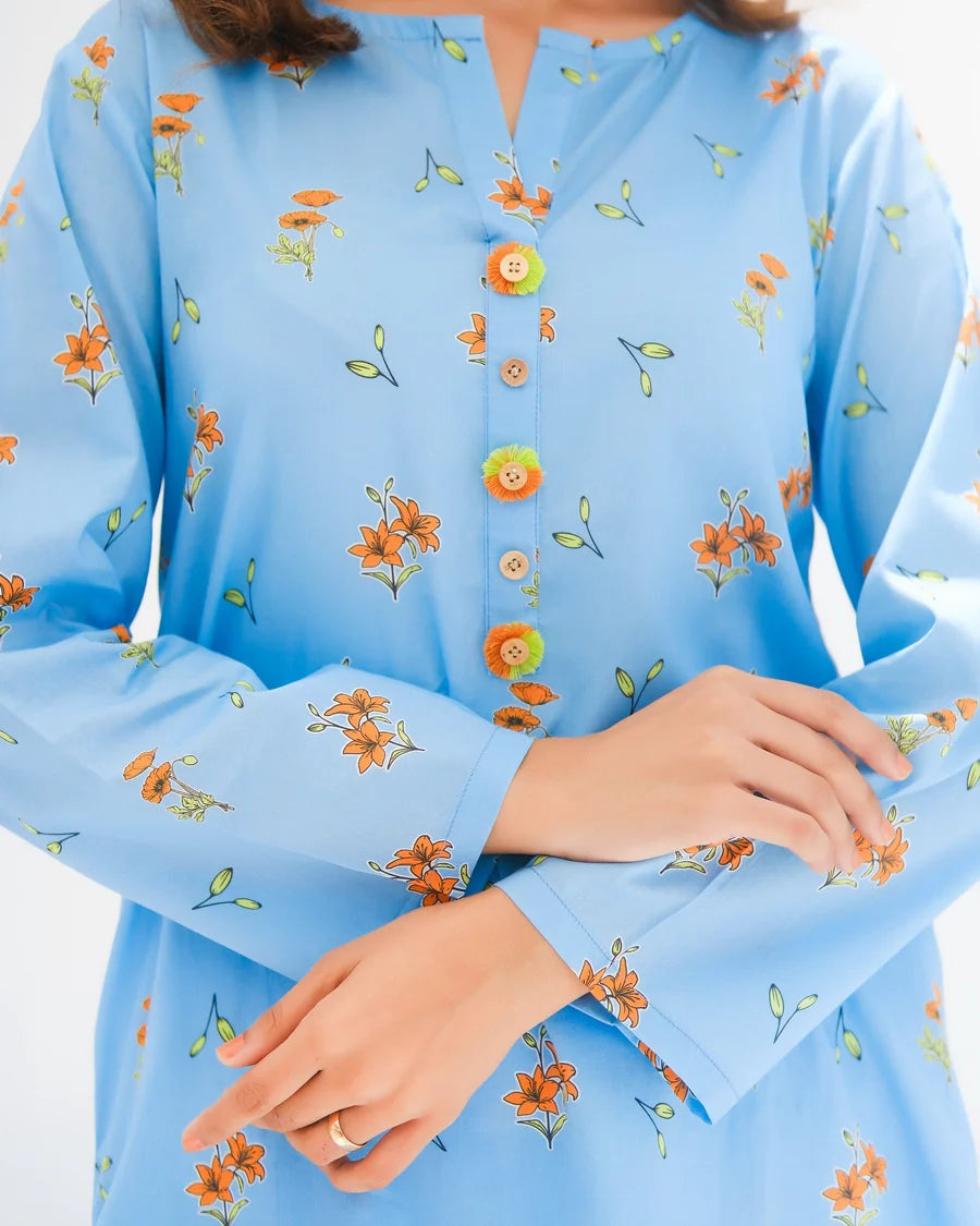 Step up your wardrobe with our exquisite printed Matching separates. This stunning 2-pc enhances intricate button detailing on the neckline of the shirt with convenient side pockets, and perfectly paired trousers.
