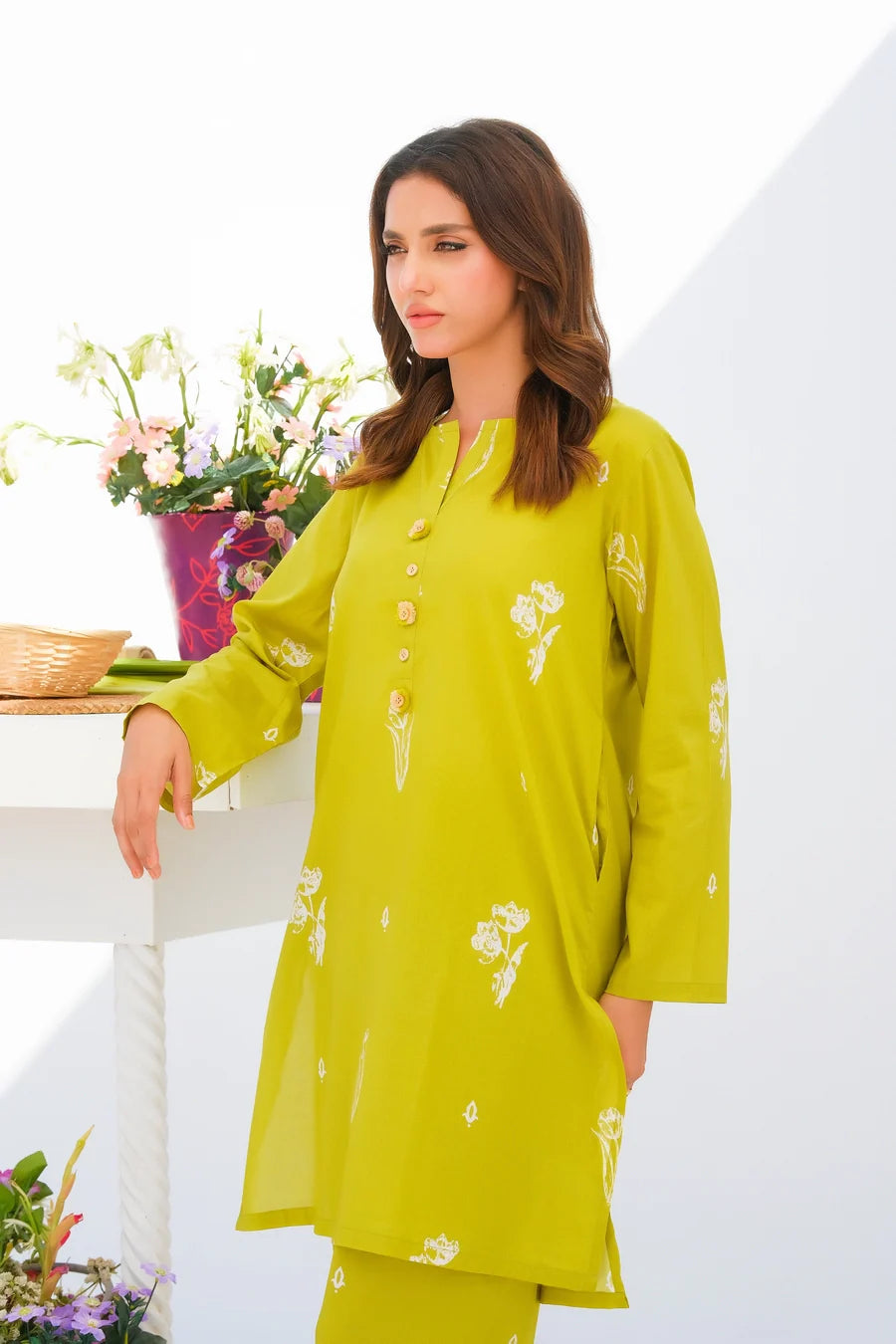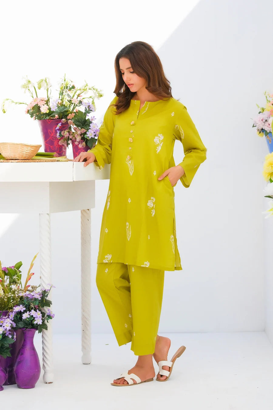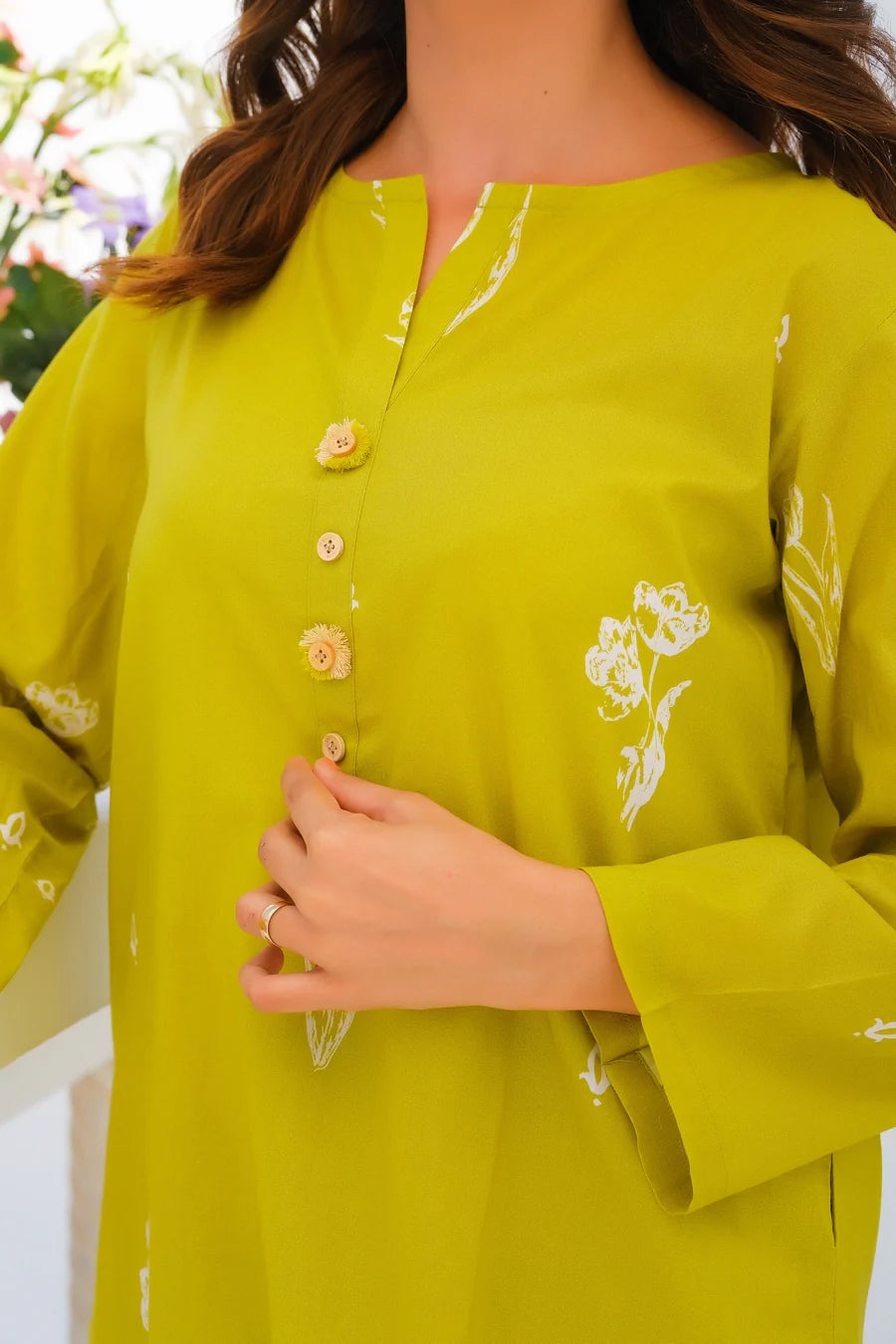 Step up your wardrobe with our exquisite printed Matching separates. This stunning 2-pc enhances intricate button detailing on the neckline of the shirt with convenient side pockets, and perfectly paired trousers.