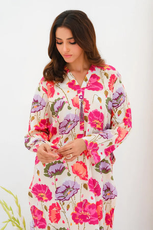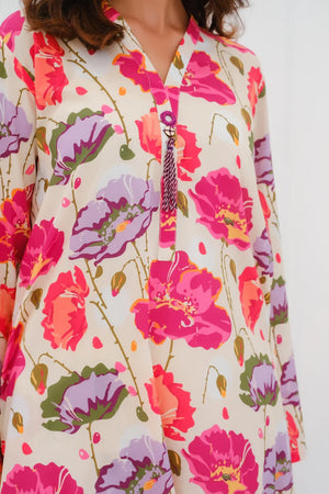 Step up your wardrobe with our exquisite printed Matching separates. This stunning 2-pc enhances intricate button detailing on the neckline of the shirt with convenient side pockets, and perfectly paired trousers.