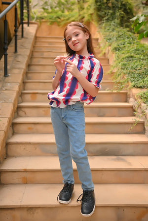A trendy composition is layered over this elegant top rendered in white brown shade. It features a contemporary button down top rendered adorned with elasticated sleeves opening and enhanced with intricate stipes print in vibrant hues. Style this gorgeous top and fun events and let your kids enjoy this any season.